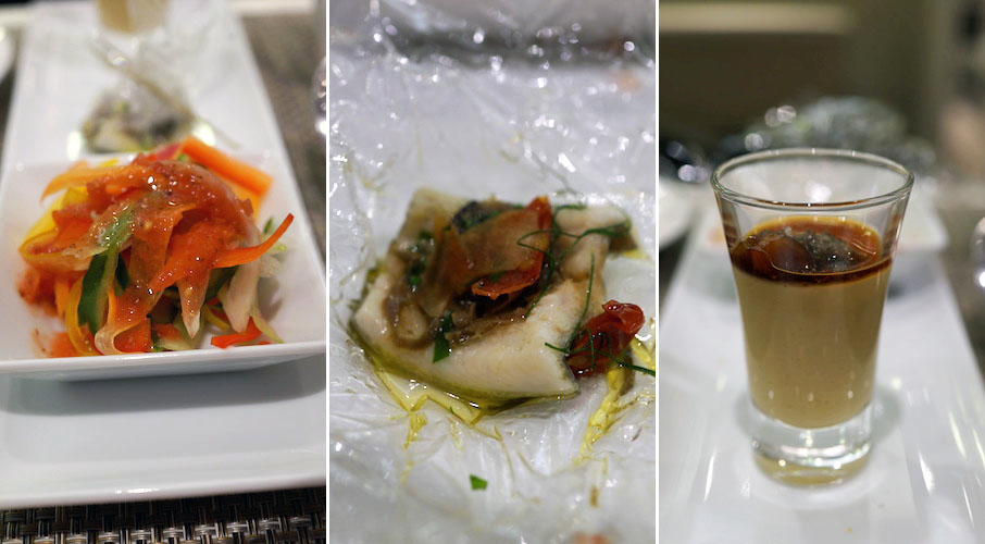 まずは前菜。細長いお皿に一列に三品並ぶ。しかもそれを縦において、さぁ、召し上がれ…、というプレゼンテーション。