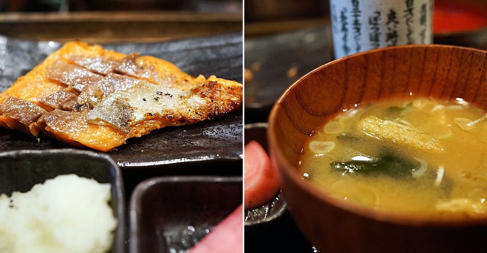 ボクがたのんだのはキングサーモンの西京漬けで、780円という値段でたしかにそれに釣り合う厚さに大きさ…、なかなかお値頃を感じます。