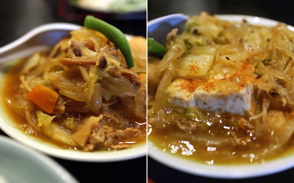 白菜、エノキ、玉ねぎ、ニンジン、シメジにネギ。肉は豚肉で、すべてがしっとりやわらかくなるまで煮こまれてる。