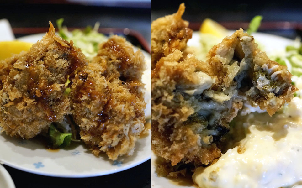牡蠣がフックラ。むされたように仕上がっていて、プチュンとジュースがほとばしりでる。パン粉のカサカサ、乾いた食感と好対照で、そこにたっぷりタルタルソース。たっぷり乗っけて味わうと、ご飯がすすむ、まさに名品。