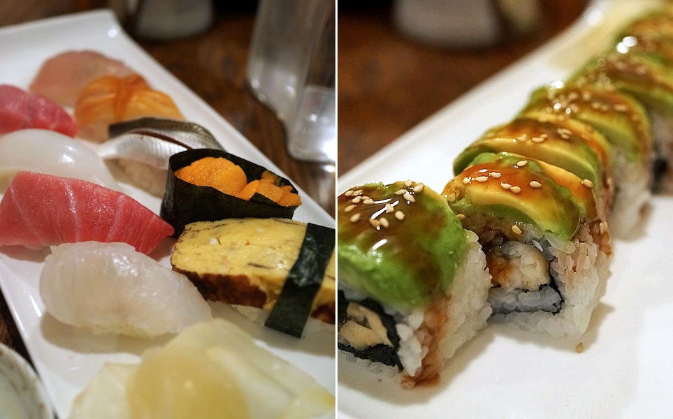 にぎりも旨いが、ロール寿司が何種類も揃っているのがまたオモシロく、中でもアボカドと焼いた穴子にカニのほぐし身、キュウリをクルンと巻いた上、甘いツメ塗り味わうドラゴンロールがなんとも言えぬオキニイリ。
