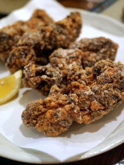 とても特徴的な唐揚げで、鶏もも肉を棒状に細長く切り分けて、醤油風味のタレでじっくり漬け込んだモノ。