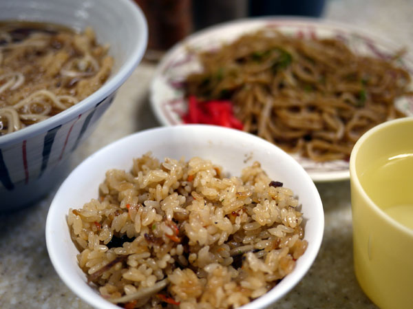 若干、シットリとして柔らかめの炊き上がりではあるけれど、おこげがタップリ混じってて焼きそばや濃いめの蕎麦ツユと一緒に食べても決して負けない田舎風。