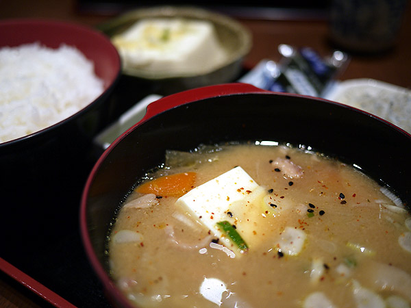 揚げ物の味に負けないちょっと濃いめでこってりとした汁もおいしい。