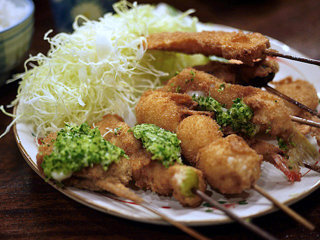 右手が串と箸の間をいったりきたりするのにちょっと手間取って、とんかつなんかの普通の揚げ物を食べるよりも時間がかかる。