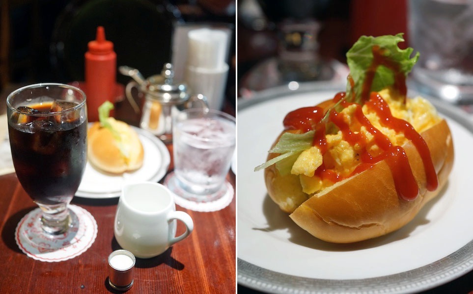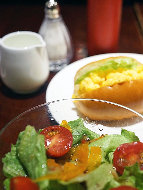 ロールブレッドにスクランブルエッグを詰めた玉子ロールとサラダをアイスコーヒーと一緒にください…、とお願いをした。