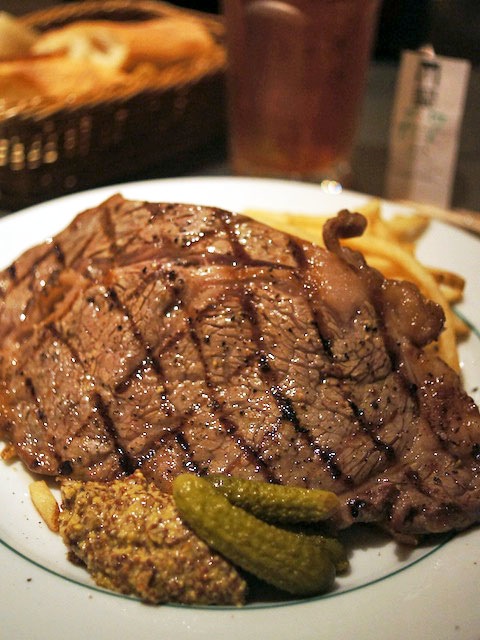中でもリブアイステーキがほどよい値段で食べられて、たいていここでは、それにする。