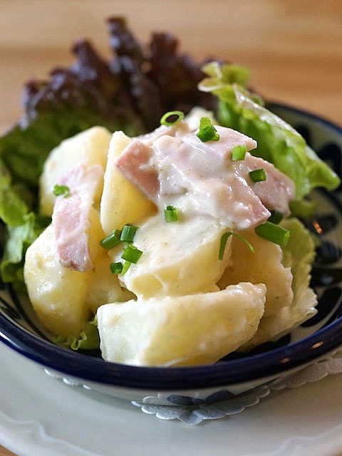 ハムと茹でたじゃがいもをクリーミーなドレッシングであえて仕上げたように見え、ところが食べるとコレが酸っぱい。