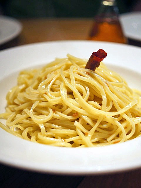 昔ながらの手打ちパスタも健在で、例えばタリオリーニのペペロンチーニ。
