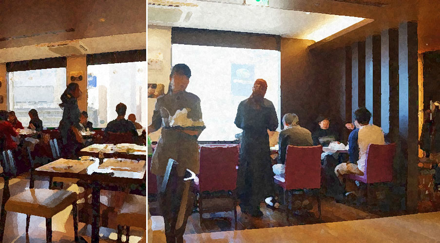 小田急百貨店の中にある、トロワグロがプロデュースした気軽なレストラン。かなり人気があって、ランチタイムにはたいてい待ちの行列なんだけど、一人がけのテーブルがあり、一人客はそこを優先的に回してくれる。