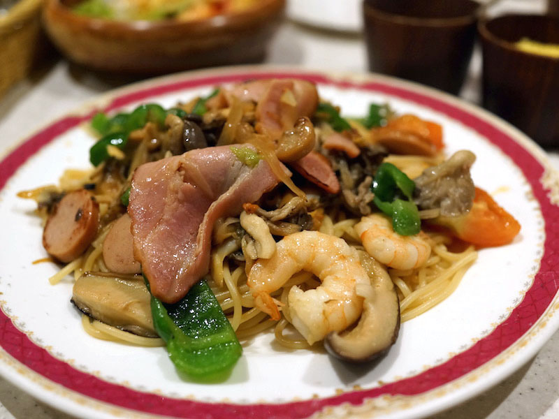 しめじにしいたけ、マッシュルーム。白ソーセージにベーコン、アサリにむきえびに、ピーマン、トマトと具材タップリ。スパゲティーというよりも炒め野菜に麺が混じっているような、具だくさんにウットリします。