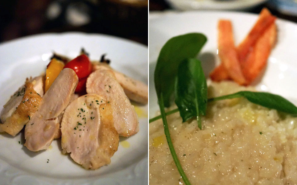 ローストチキンのむな肉と、同じくローストした野菜。しっとりとした鶏の旨みを堪能しつつ、ムール貝とはまぐりの出汁で炊いてもらったリゾットを〆に味わう。