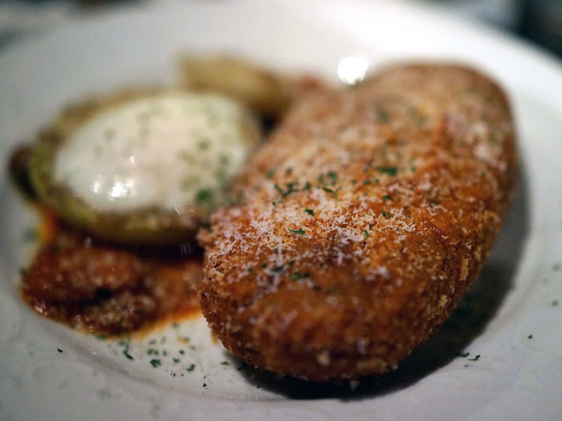 細かなパン粉がギッシリ貼り付き、パリッと揚がったラグビーボール状の大きなかたまり。中は煮込んだ牛肉をほぐしてジャガイモと一緒に炒めた、つまりコーンビーフハッシュのようで、ネットリ旨い。