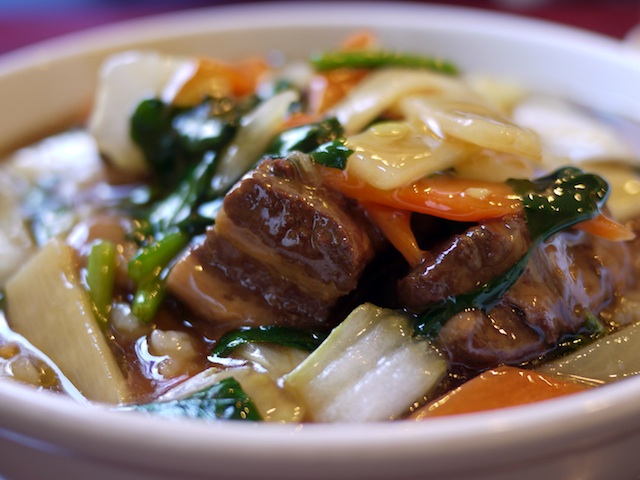 かなりタップリで二度蒸しをしたハリある麺より炒めた野菜や肉の量の方がずっと多い。