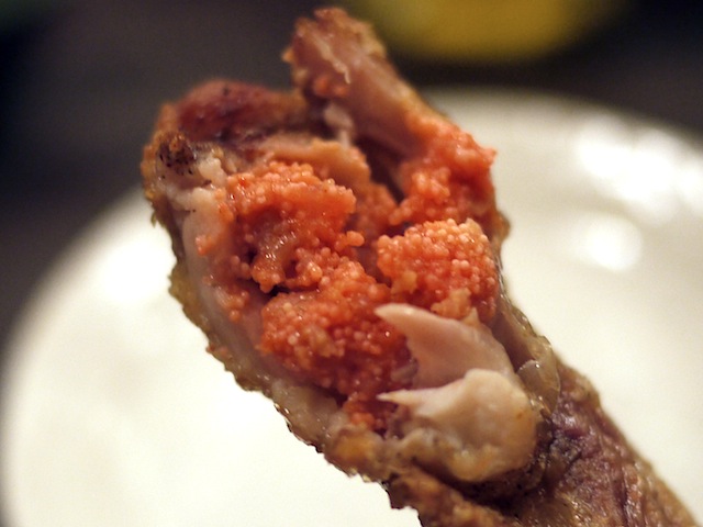 博多明太子を中にギッシリ詰め込んだ、手羽先揚げ。