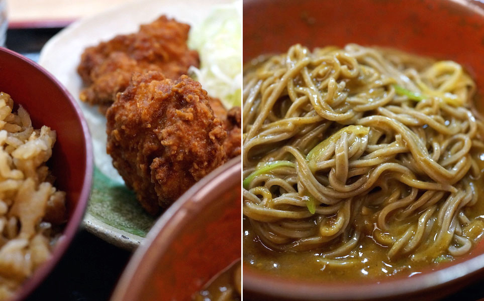 それに炊き込みご飯を追加して、みると鶏の唐揚げがおすすめだという。唐揚げをカレーそばのスープに浮かべて衣をトロンとさせて食べたらおいしいだろう…、と思って一緒に唐揚げたのむ。