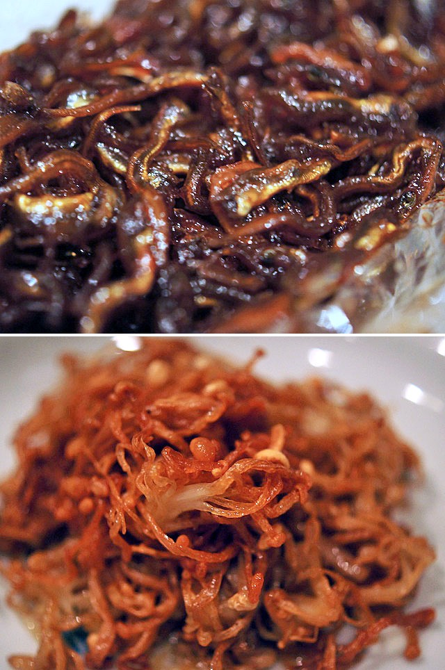 見ててもわかるほどに油がクツクツ沸騰してきてそこで、エノキが揚がるようにコンガリ色をかえてく。