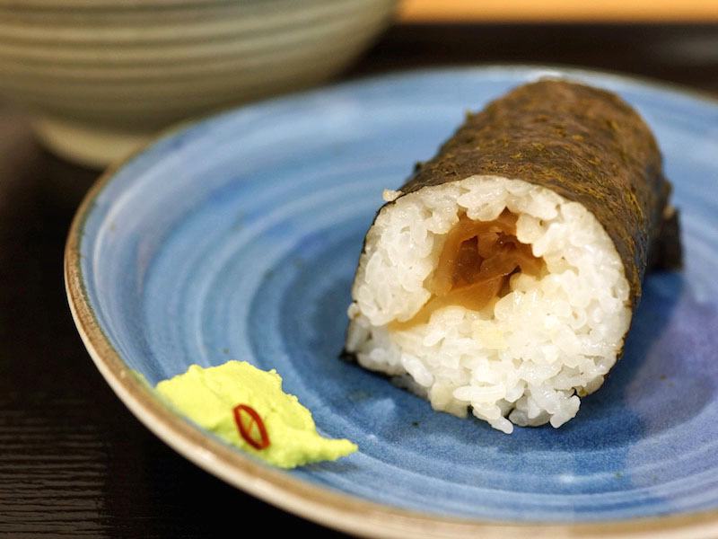 細巻きと太巻きのちょうどまんなか位の太さで、口にピタッとはまるたのしさ。海苔巻きと言いつつご飯は酢飯で、中にかんぴょう。