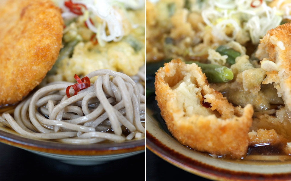 インゲン天がキュッキュと奥歯に痒い食感。一転、コロッケはシットリとしてなめらかで、油の香りが出汁にうつってゴチソウ感を盛り上げる。