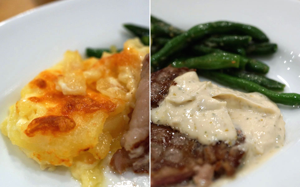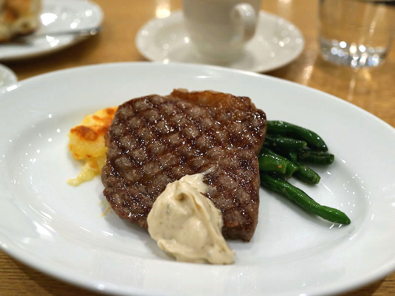 サイドのポテトグラタンもチーズのコクとソースの旨み。ポテト自体の甘みがひとつに交じり合い、いんげん豆のキュッキュと奥歯をくすぐるような歯切れ感もまたオゴチソウ。