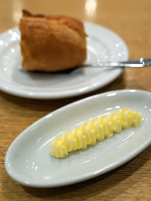 オーブンの中であっためたバゲットが来る。パリッと皮が香ばしく、しかも一緒にやってくるバターがキレイに搾り出されてあぁ、エレガント。