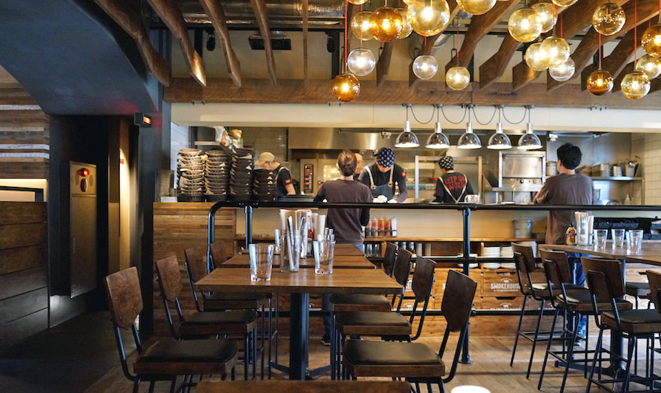 壁面全部を使ったオープンキッチンに、特徴的な照明とカジュアルだけどどこか特別。かなり好き。