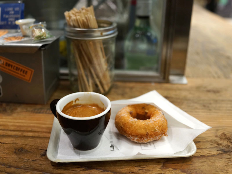 ちなみにエスプレッソはそこそこの味。けれど小さなドーナッツ。がっしりしててグラニュー糖がジャリジャリと、昔、駄菓子屋さんで売ってたドーナツのスゴく上等でおいしいモノって感じがおいしい。さぁ、移動。