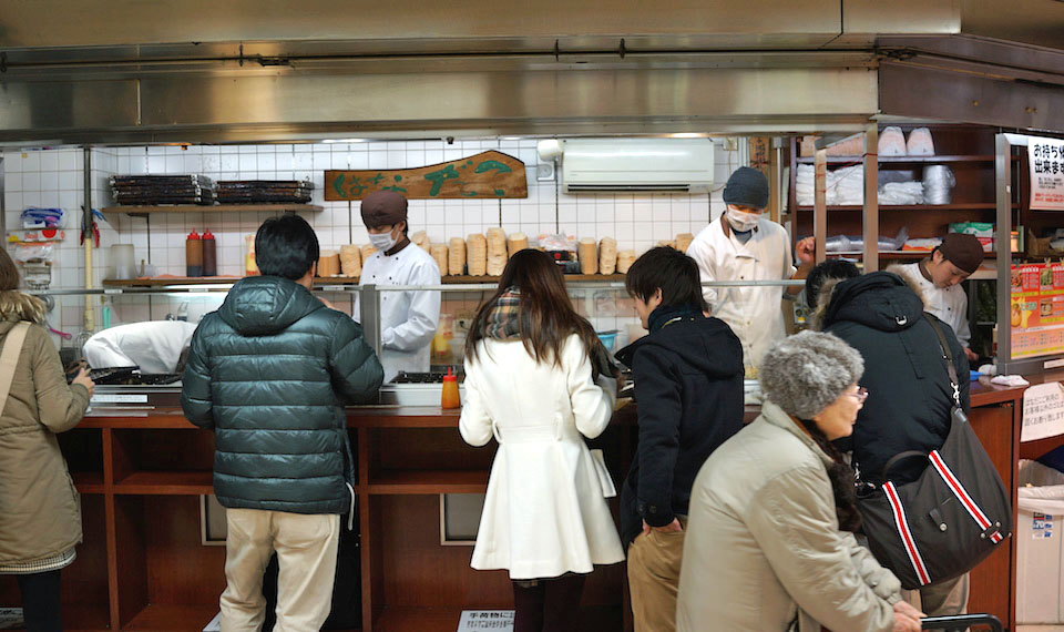 お店の前にただよう香り。お店の人が声掛け合って、焼き上げ、盛り付け提供しそれをハフハフ食べる人たちの美味しい顔が背中を見ていて、見えるよう。