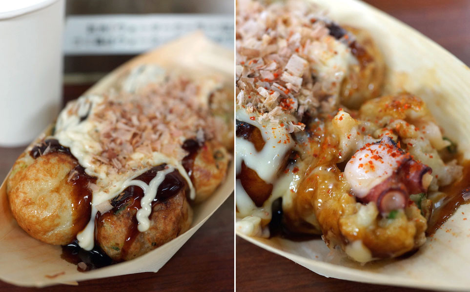 タコも大きくコリコリしてて、それが生地のなめらかさを引き立てなんともおいしく、銀だこなんかの揚げて仕上げるたこ焼きとはまるで別物。