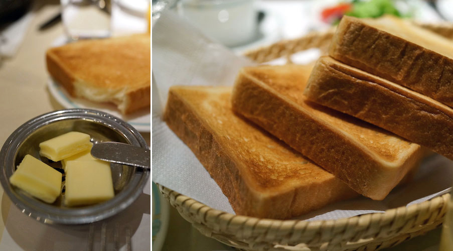 父はサニーサイドアップに浅めに焼いたトーストが好き。ボクはよく焼きと、同じ料理であってもまるで違った状態でやってくる。しっとりとしたベーコンにパンのサイドには銀の器に入ったバター。