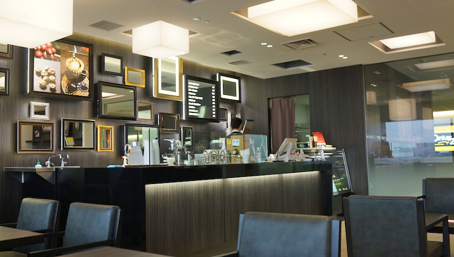 飛行場の中とは思えぬキリッと凛々しく、都会的なるたのしい空間。