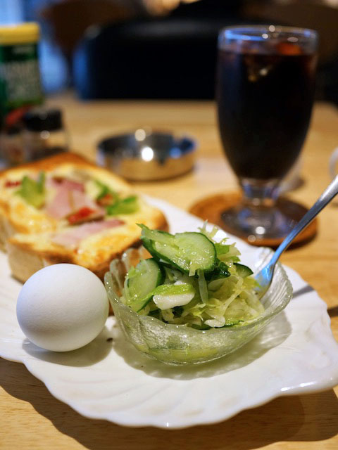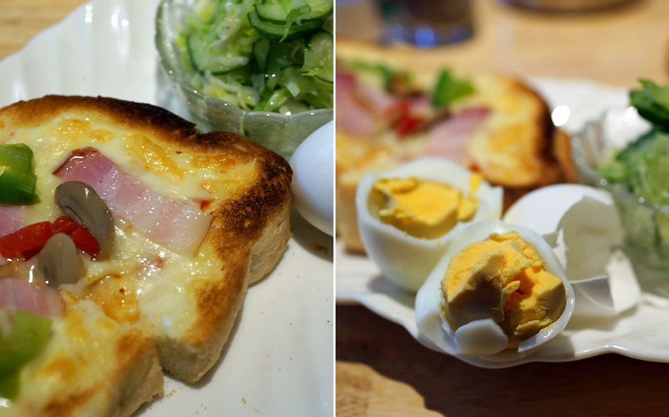 油をほとんど使わず塩とほんの少しのうま味調味料で味ととのえた、朝のお腹にうれしいひと品…、ピザトーストにゆで玉子がギッシリ肩を寄せ合う姿にお腹がなります、いただきます!
