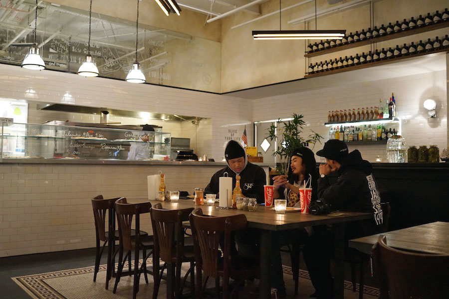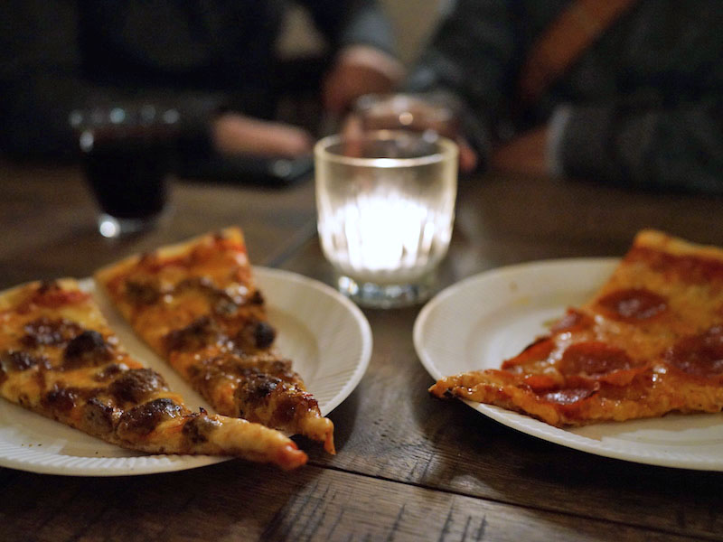 薄くてバリッとしたピザで、さっくり歯切れて噛めば噛むほど小麦の旨みや、焼けた香りが口に広がる。具材もシンプル。ペパロニ、ソーセージとかマッシュルームとアメリカ的で風味も濃厚。1切れほぼ500円という価格設定も単純でいい。
