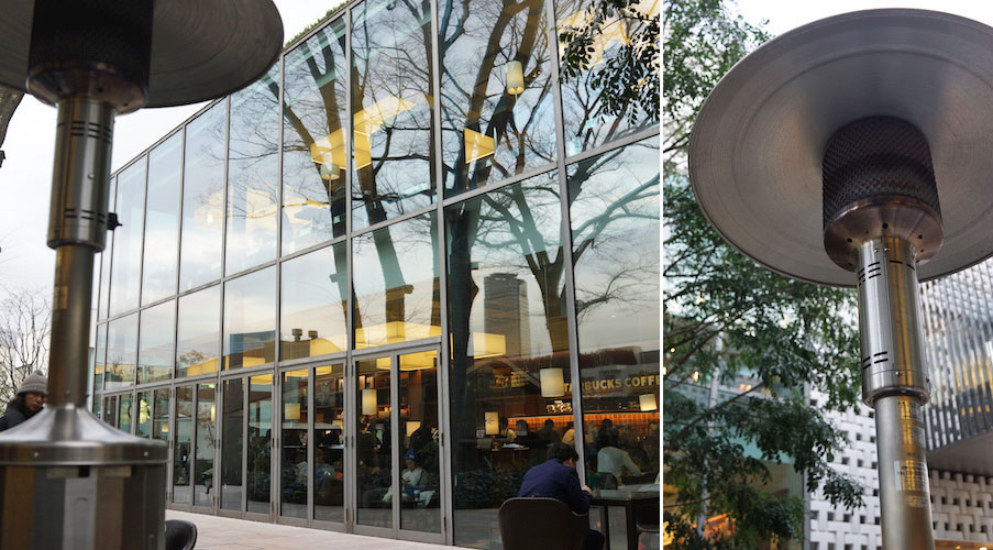 屋外のテーブルの横には大きな傘型のヒーターが置かれてこれが温かい。額がチリチリするほどに上から熱気が降り注ぎ、これで足元が暖かければいうことないのにと思ったりする。