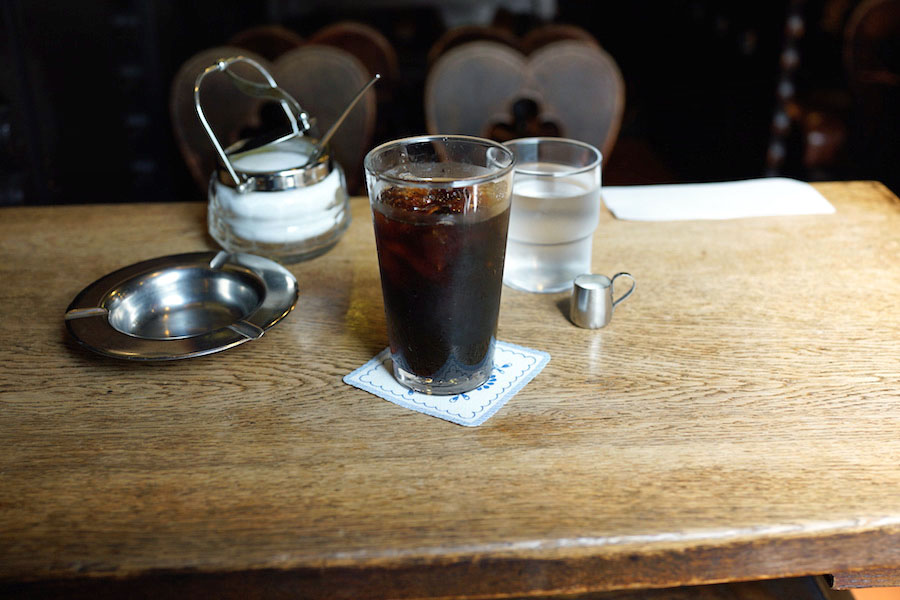 あらかじめ甘く作ったアイスコーヒー。ほどよいサイズのグラスに入り、やさしい苦味とほどよき甘さで体にしみる。