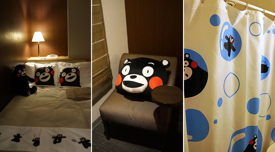 ところで昨日ホテルに到着したら、通常の部屋が埋まっていて、くまモンルームならご用意できるのですけれど…、というので「いいですよ!」って言って部屋に入ったら…。