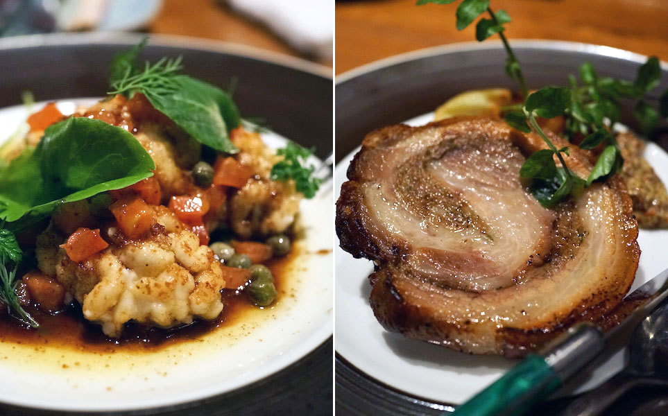 豚バラ肉のローストは、肉にソーセージをミンチにしたのをたっぷり塗って、それをグルンと丸めて焼いたの。クミンシードやオレガノの香りが豚の脂をおいしくしてくれる。