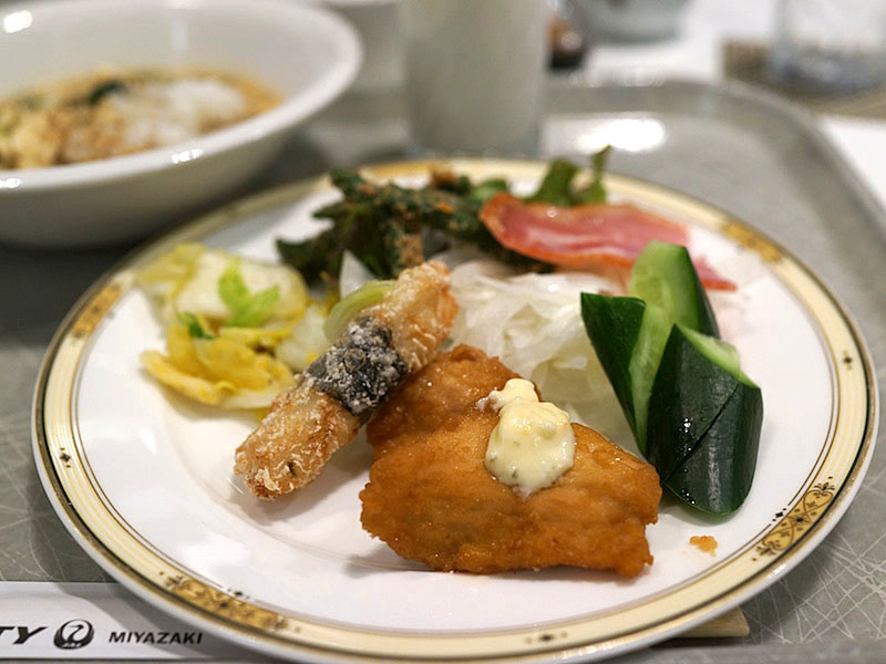 朝食バフェに料理がズラッと並んだところを見ると不思議と、食欲やってくるのです。しかもチキン南蛮があって、それをメインにすえてレタスに玉ねぎ、白菜浅漬け、きゅうりにベーコンと目につくものをキレイにお皿に並べて食べる。