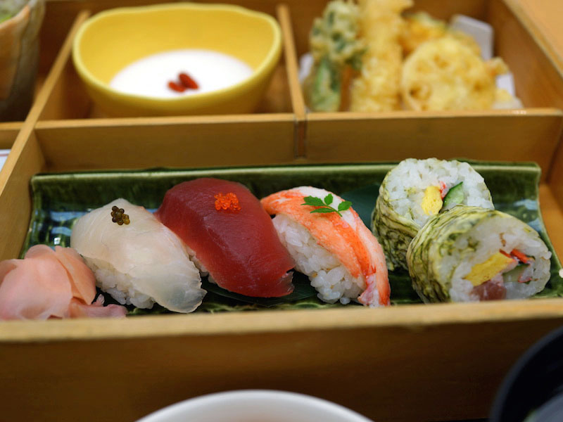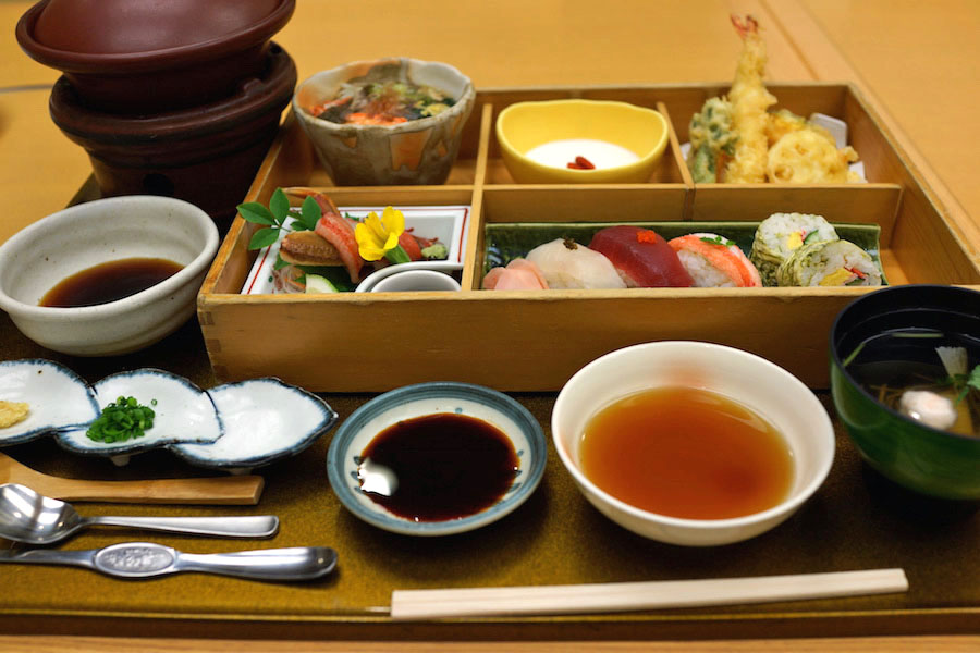 長方形の木枠の中に料理があれこれ。どれもがキレイな器によそおわれ、それらがキチンと木枠の中に収まっている。