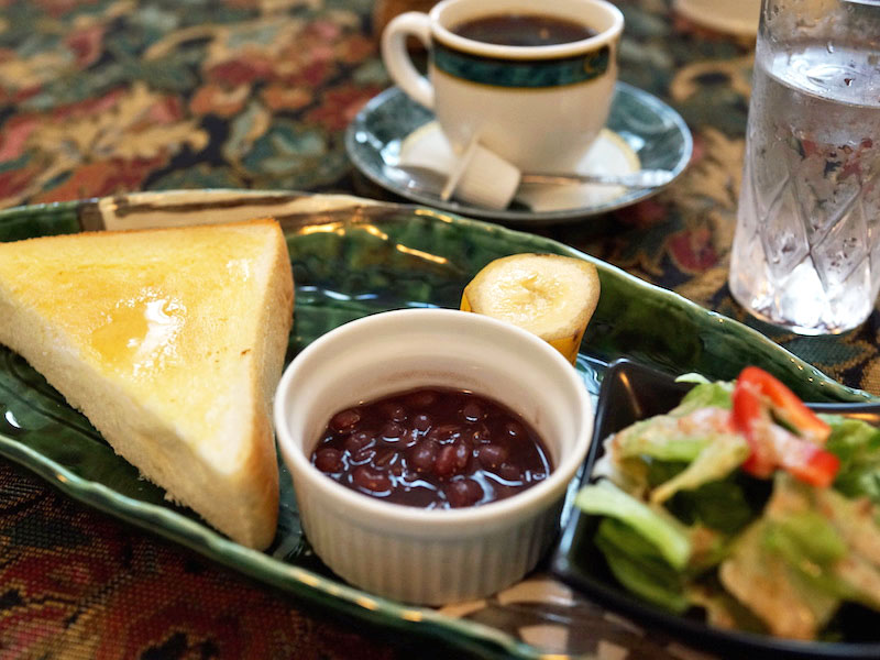 小倉トーストもいいかとちょっと思いもしたけれど、さすがに朝から甘いアンコはちょっとなぁ…、とバターを選んでたのんでみたら、サイドにしっかりアンコが乗ってた(笑)。