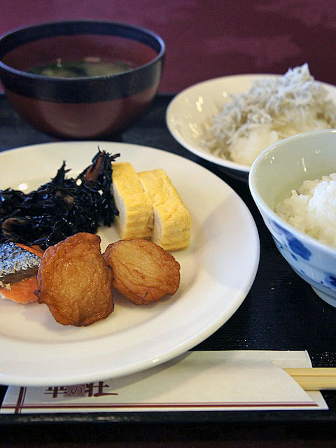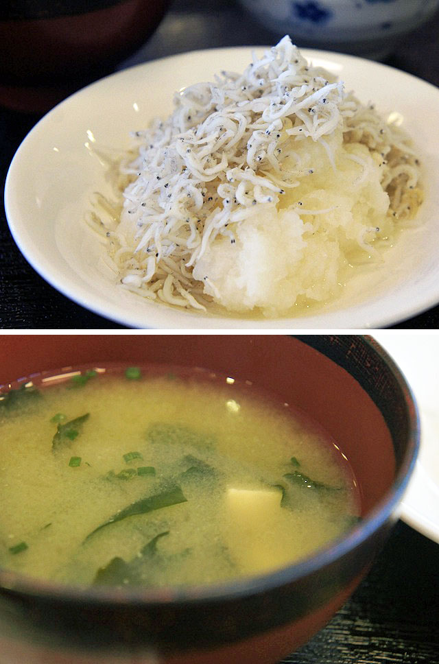 しらすおろしをタップリよそおい、ご飯に味噌汁、味付け海苔と、和食セットのようにお膳をよそおった。