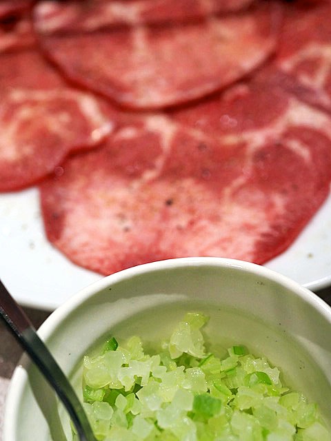 薄切りタンに塩と胡椒をほどこして、こんがり焼いたらそこに刻んだネギをのっける…、あとのせスタイルのネギタン塩で、ネギの食感、風味がたのしい。