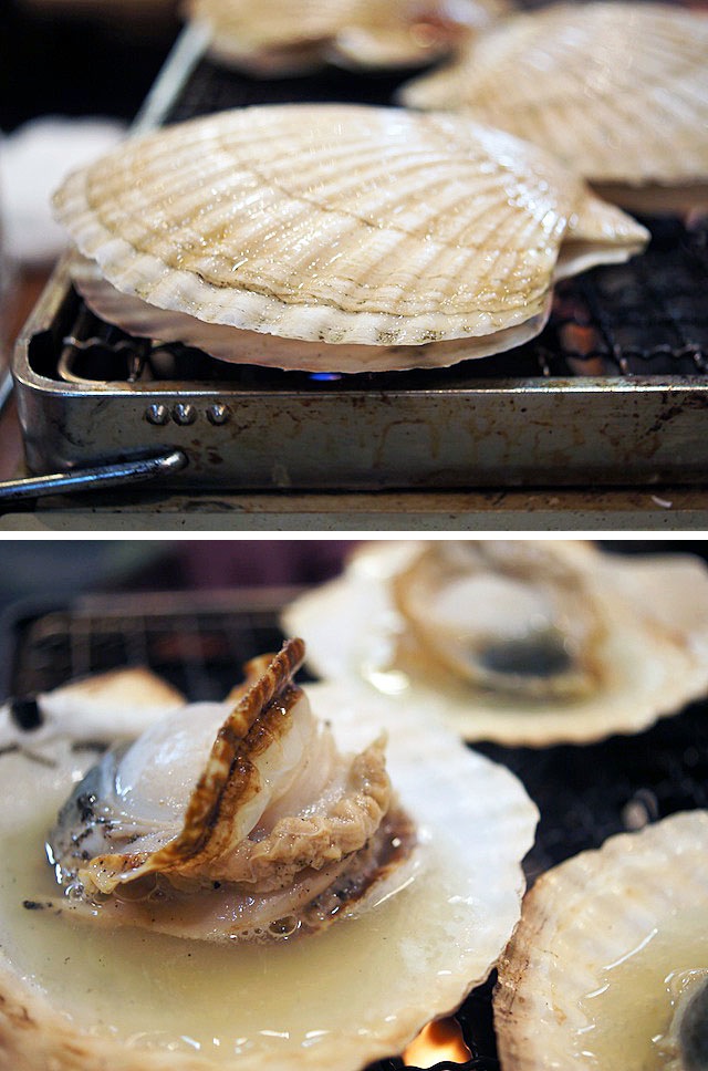 火であぶられた下側の殻に貼りついていたホタテの柱が外れて殻が開くのですね。
