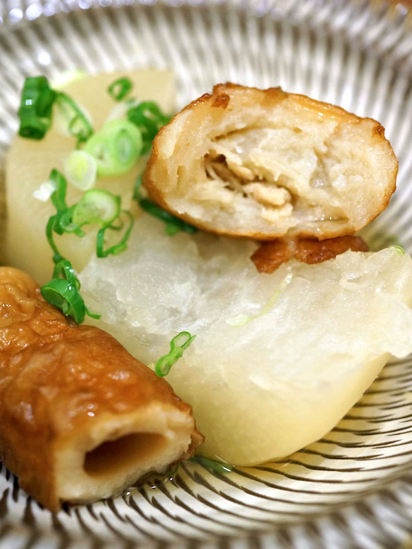 おでんは3種。大根、竹輪。それになんと餃子巻き!