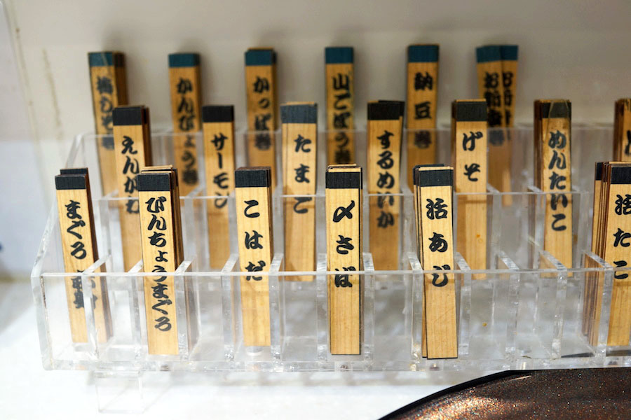 ネタの名前を書いた木札を、カウンターの上に置かれた小さな皿に入れて注文するのがココのシステム。チリンと軽快な音がして、それを確かめ寿司ができ「お待たせしました」とストンと寿司がやってくる。そのリズムがとても楽しくて好き。
