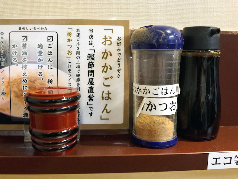 カウンターの上にはご飯用の粉カツオ。醤油が置かれて、ほとんどの人が小さな茶碗にご飯をもらって、蕎麦のお供にしてる。