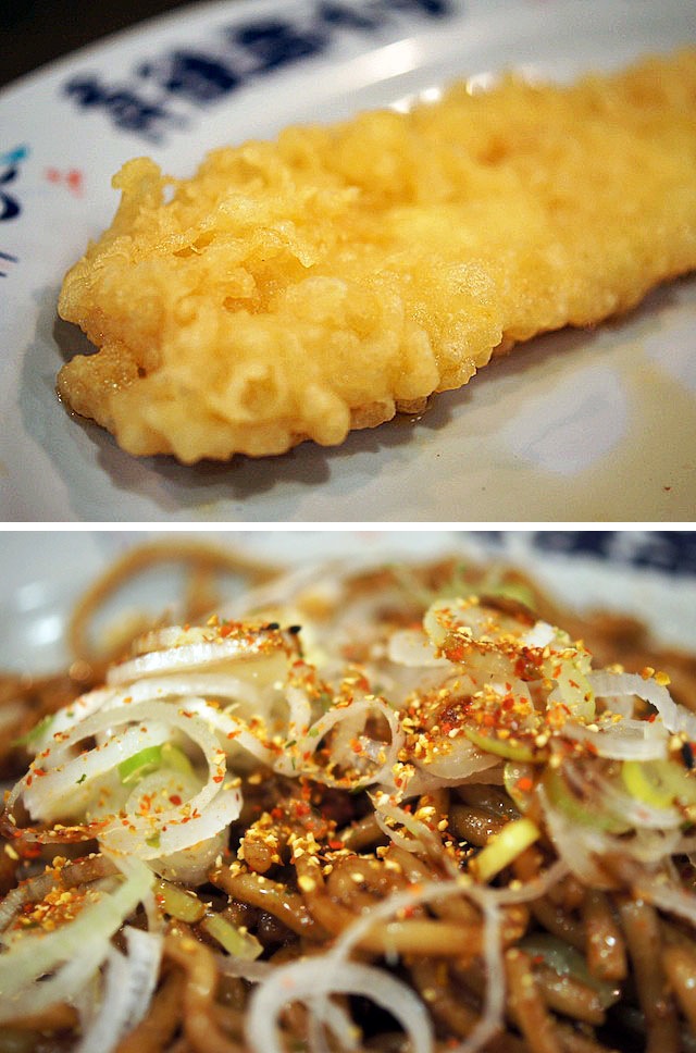 焼きそばに天ぷら?って、少々、合わないようにはじめは思ったんだけど、ココで焼きそばたのむ人の3人に一人くらいの割合で、天ぷらたのんでいたので試した。