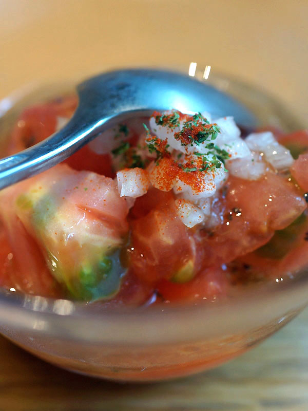 ガラスの器も食材ひとつひとつ、それをすくって食べるスプーンも冷たくて体がキリッとひきしまる。トマトの酸味で食欲もわく…、名品なり。