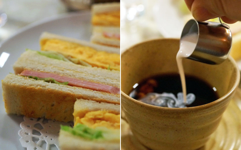 卵サンドとハムのサンドイッチを半分づつ。どちらもにレタスがはさまり、マヨネーズ。パンはこんがりトーストをしたオキニイリ。