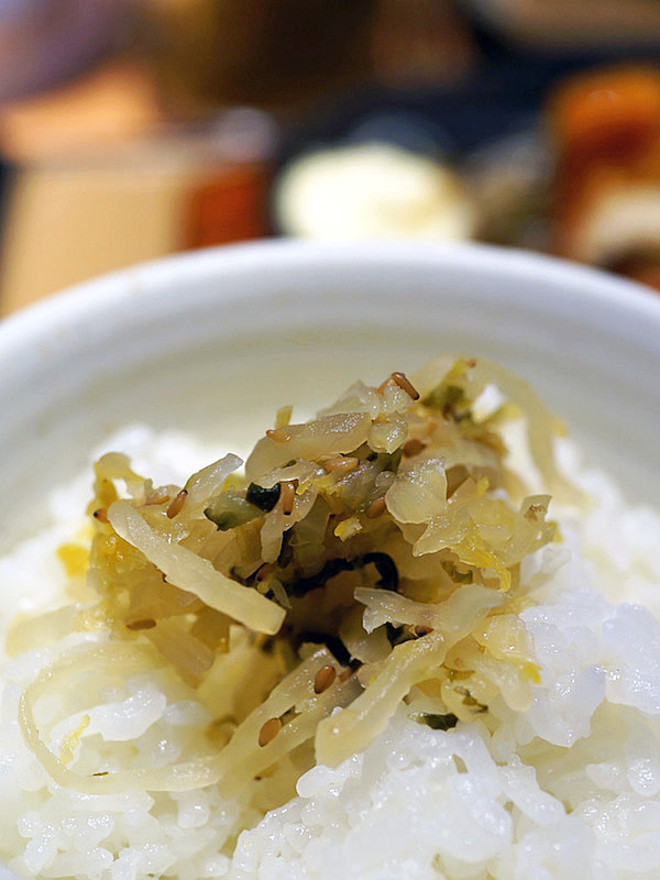 最初はご飯がおいしくなかった。けれどそれが改善されて、たちまち人気に火がついた。千切りたくわんに大葉に胡麻を混ぜた漬物が、おかわり自由のご飯をおいしくしてくれるのもありがたい。